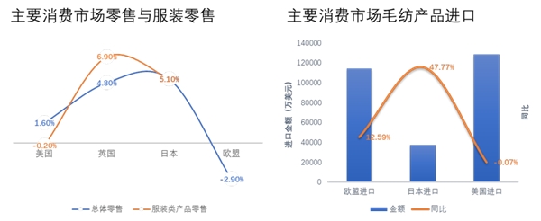 (注:美國、英國零售市場數(shù)據(jù)為5月數(shù)據(jù)、歐盟、日本零售市場為4月數(shù)據(jù);美國、日本毛紡進(jìn)口數(shù)據(jù)為1~5月數(shù)據(jù),歐盟毛紡進(jìn)口數(shù)據(jù)為1~3月數(shù)據(jù))
