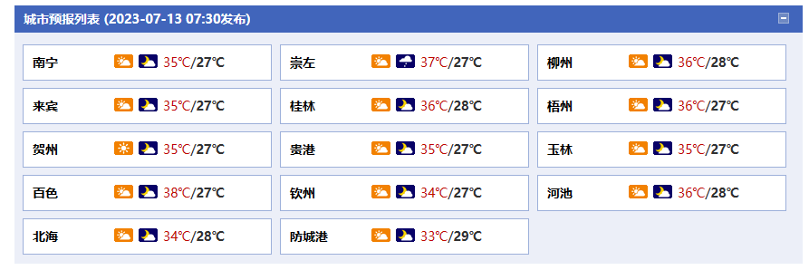 南寧市:今天白天到晚上,多云、局地有陣雨或雷雨,偏南風(fēng)2~3級,最高氣溫35℃,最低氣溫27℃。