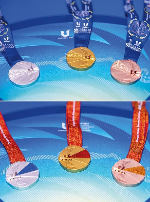 下圖為3月18日拍攝的第31屆世界大學生夏季運動會獎牌“蓉光”背面