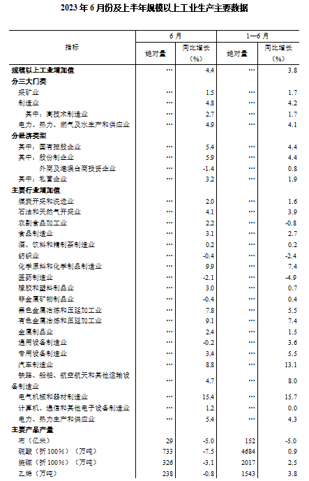 上半年,規(guī)模以上工業(yè)增加值同比增長3.8%(增加值增速均為扣除價格因素的實(shí)際增長率)。6月份,規(guī)模以上工業(yè)增加值同比實(shí)際增長4.4%。