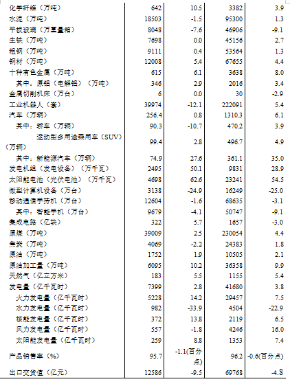 分產(chǎn)品看,上半年,620種產(chǎn)品中有331種產(chǎn)品產(chǎn)量同比增長。鋼材67655萬噸,同比增長4.4%;水泥95300萬噸,增長1.3%;十種有色金屬3638萬噸,增長8.0%;乙烯1543萬噸,增長3.8%;汽車1310.3萬輛,增長6.1%,其中新能源汽車361.1萬輛,增長35.0%;發(fā)電量41680億千瓦時,增長3.8%;原油加工量36358萬噸,增長9.9%。