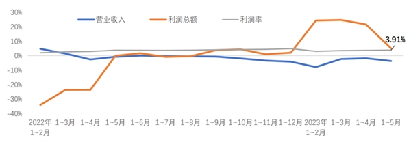圖1. 2022~2023年1-5月我國規(guī)模以上家用紡織品企業(yè)營業(yè)收入及利潤增長趨勢