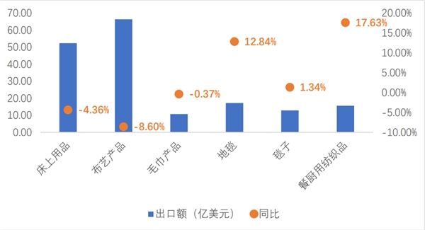 圖2. 2023年1-5月我國家用紡織品主要大類產(chǎn)品出口額及同比