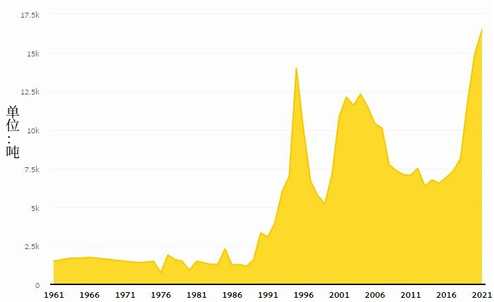 從歷史數(shù)據(jù)可了解到,越南的繅絲用繭年產(chǎn)量最高峰為2021年的16457噸,最低谷為1976年的758噸。