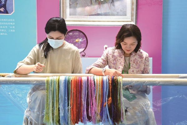 姚建萍(右)與女兒姚蘭共同創(chuàng)作蘇繡作品