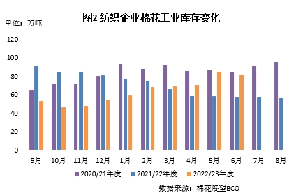 6月以來紡織企業(yè)訂單走弱,對高棉價(jià)接受力度不足,采購不積極性,原料庫存小幅下降。截至6月30日,紡織企業(yè)在庫棉花工業(yè)庫存量為82.22萬噸,較上月底減少3.22萬噸,同比增加24.31萬噸。其中:37%的企業(yè)減少棉花庫存,18%增加庫存,45%基本保持不變。