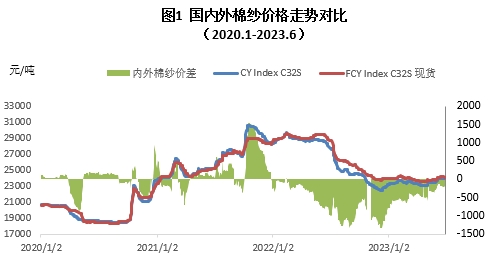 本月內(nèi)外棉紗價(jià)格上漲。國產(chǎn)32支純棉紗6月均價(jià)為23917元/噸,較上月上漲了498元/噸,漲幅2.13%,較去年同期下降了4495元/噸,跌幅19.2%;進(jìn)口32支純棉紗6
