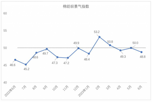 說明:中國(guó)棉紡織行業(yè)景氣指數(shù)采集自全國(guó)近500家次棉紡織廠,參考國(guó)家制造業(yè)PMI等指數(shù)制定方式,通過對(duì)多個(gè)主要指標(biāo)加權(quán)計(jì)算得出,當(dāng)指數(shù)高于50,表示棉紡織行業(yè)本月景氣程度好于上月,低于50則表示本月景氣程度不及上月。