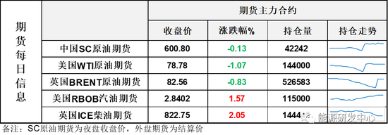 【1】WTI主力原油期貨收跌0.85美元,跌幅1.07%,報78.78美元/桶;布倫特主力原油期貨收跌0.69美元,跌幅0.83%,報82.56美元/桶;INE原油期貨收跌0.13%,報600.8元。