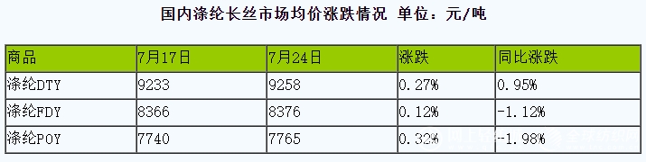 近期國內(nèi)滌綸長絲市場行情漲勢有所放緩,據(jù)生意社商品行情分析系統(tǒng),截止7月24日江浙地區(qū)主流滌綸長絲工廠,滌綸POY(150D/48F)報(bào)價(jià)在7550-8100元/噸,滌綸DTY(150D/48F低彈)報(bào)價(jià)在8950-9350元/噸,滌綸FDY(150D/96F)報(bào)價(jià)在8250-8700元/噸。