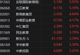 教育股集體走強。消息面上,教育部辦公廳近日發(fā)布《關于加快推進現代職業(yè)教育體系建設改革重點任務的通知》指出,到2025年,建成300所左右全國性信息化標桿學校,帶動建設1000所左右區(qū)域性信息化標桿學校,推動信息技術與職業(yè)院校辦學深度融合。