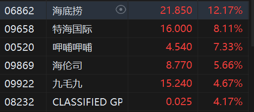餐飲股集體走強(qiáng),海底撈漲超12%,呷哺呷哺(4.54, 0.31, 7.33%)、特海國際(16, 1.20, 8.11%)、海倫司(8.77, 0.47, 5.66%)漲幅明顯。消息面上,7月30日晚間,海底撈國際控股有限公司、發(fā)布正面盈利預(yù)告。截至2023年6月30日,海底撈營收同比增長超過23.7%,凈利潤同比增超29倍。