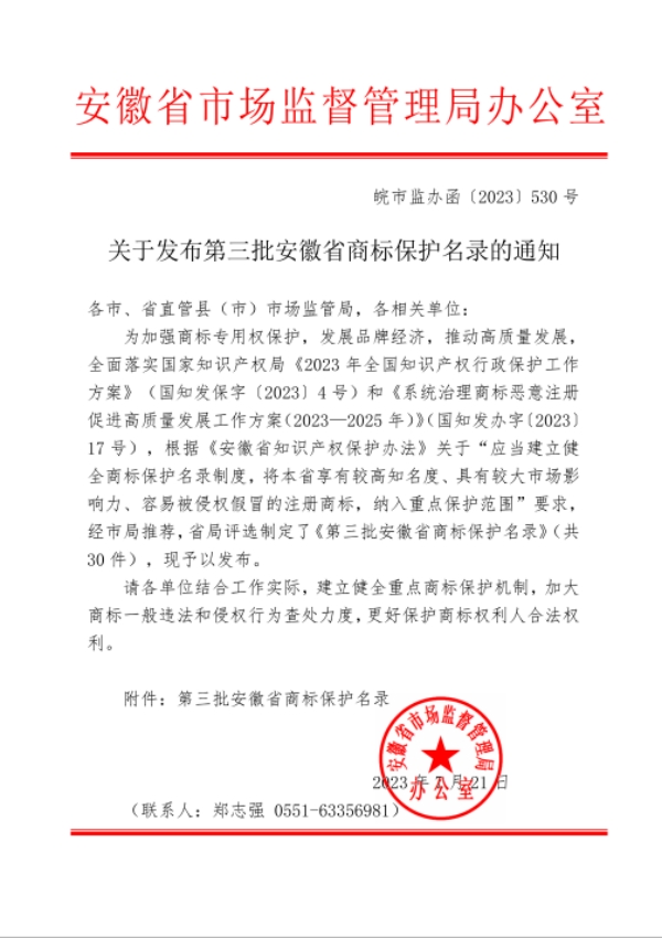 據(jù)了解,此次《第三批安徽省商標保護名錄》的評選發(fā)布,是全面落實國家知識產(chǎn)權(quán)局《2023全國知識產(chǎn)權(quán)行政保護工作方案》和《系統(tǒng)治理商標惡意注冊促進高質(zhì)量發(fā)展工作方案(2023-2025)》的體現(xiàn)。根據(jù)《安徽省知識產(chǎn)權(quán)保護辦法》關(guān)于“應(yīng)當(dāng)建立健全商標保護名錄制度,將本身享有較高知名度、具有較大市場影響力、容易被侵權(quán)假冒的注冊商標,納入重點保護范圍”的要求,第三批安徽省商標保護名錄是對享有較高知名度、具有較大市場影響力、容易被侵權(quán)假冒、需加強保護的商標及時納入名錄予以重點保護。目的是建立健全重點商標保護機制,更好保護商標權(quán)利人合法權(quán)利,有利于加強商標專用權(quán)保護,發(fā)展品牌經(jīng)濟,推動高質(zhì)量發(fā)展,為品牌建設(shè)工作提供有力保障。