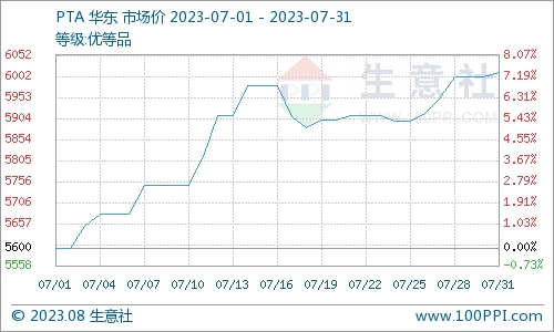 PTA市場止跌回暖整體呈現(xiàn)震蕩上行態(tài)勢,截止7月30日華東地區(qū)現(xiàn)貨市場均價(jià)在6000元/噸,較月初上漲7.16%。此前受到部分裝置檢修PTA開工率一度降低至74%以下,但隨著7月下旬陸續(xù)重啟,疊加恒力一套250萬噸的新產(chǎn)能投產(chǎn)成功,PTA供應(yīng)再度恢復(fù)至高位,開工率提升至當(dāng)前80%附近。另外,恒力石化惠州250萬噸新項(xiàng)目逐步量產(chǎn),供應(yīng)面有所增壓。