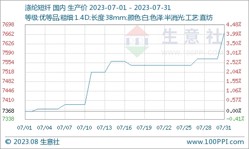 據(jù)生意社商品行情分析系統(tǒng),國內(nèi)滌綸短纖市場行情止跌反彈,截止7月31日1.4D*38mm滌短價(jià)格工廠均價(jià)為7668元/噸,同比上漲4.07%。