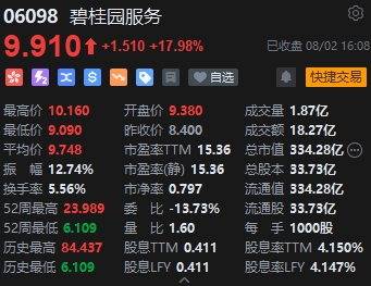 物管股逆勢上漲,碧桂園服務(wù)(9.91, 1.51, 17.98%)漲近18%領(lǐng)銜。消息面上,碧桂園服務(wù)發(fā)布盈警,上半年,估計(jì)收入約206.5億至208.5億元,較去年同期的200.55億元有所增長。此外,碧桂園服務(wù)在昨晚表示計(jì)劃在公開市場購回股份,不多于3.37億股(占已發(fā)行股份總數(shù)的10%)。