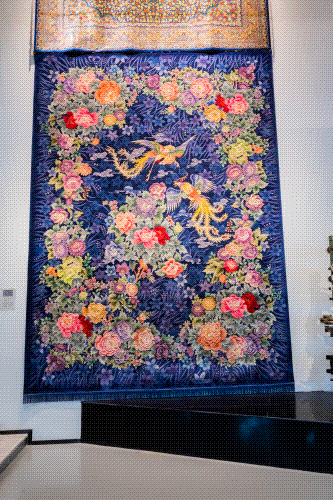 手工打結(jié)絲毯充分利用蠶絲特性,具有紋路細(xì)密緊實(shí),毯質(zhì)柔軟而有彈性,顏色鮮亮,圖案細(xì)膩,防水、防皺、不褪色、不變形等特點(diǎn)。特別是利用蠶絲線的光澤和織造的統(tǒng)一方向性。因此,當(dāng)你在一張絲毯前走動(dòng)時(shí),絲毯的每個(gè)地方由于光線角度不同,會(huì)均勻的發(fā)生“由暗及亮”或“由亮及暗”的變化,像在親臨一場近景魔術(shù),光彩四溢、十分夢幻。閬中古城人用手的溫度呵護(hù)著傳統(tǒng)工藝的生命力,讓保存在方寸之間的魔法美學(xué),在時(shí)空交換中得以世代承襲,孕育出讓世界為之矚目的東方傳奇。
