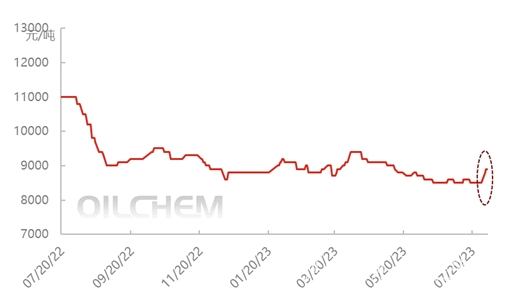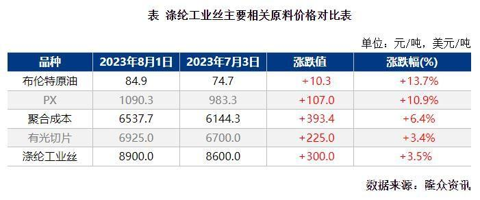 自7月下旬以來(lái)國(guó)際原油持續(xù)上漲, 布倫特漲至85美元/桶以上,美國(guó)夏季燃油消費(fèi)高峰以及亞洲經(jīng)濟(jì)前景向好均助推聚酯成本端走勢(shì),滌綸工業(yè)絲終于不負(fù)加工費(fèi)重壓,7月底市場(chǎng)成交重心上漲400元/噸,至8900元/噸,7月31日單日漲幅達(dá)3.53%,創(chuàng)今年來(lái)最大單日漲跌幅。