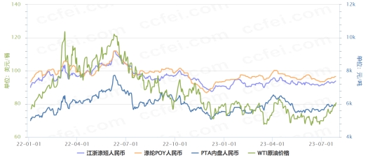 注:WTI期貨(左軸,美元/桶),PTA內(nèi)盤、滌綸POY和滌短(右軸,元/噸);資料來源:中纖網(wǎng)