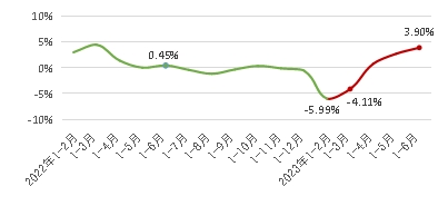 上半年,化纖行業(yè)總體開工負荷好于去年同期,除春節(jié)因素導(dǎo)致1-2月開工負荷明顯下降外,3月以來,行業(yè)開工負荷基本維持在高位。以滌綸直紡長絲為例,1-2月平均開工負荷58%附近,3-6月基本保持在80%以上,7月已提升至90%左右。但氨綸行業(yè)平均開工負荷同比下降約8個百分點,1月開工負荷在70%附近,2-4月維持在80%以上,5-6月下降至75%左右,7月有所回升。據(jù)國家統(tǒng)計局數(shù)據(jù),2023年1-6月化纖產(chǎn)量3382萬噸,同比增長3.90%,產(chǎn)量增速由年初的負增長呈逐步上升趨勢。