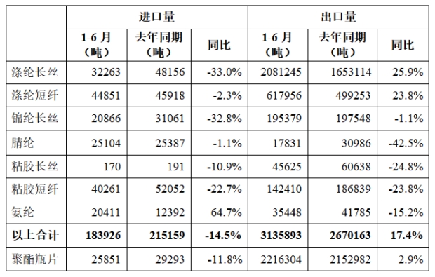 表2 2023年1-6月化纖主要產(chǎn)品進出口情況