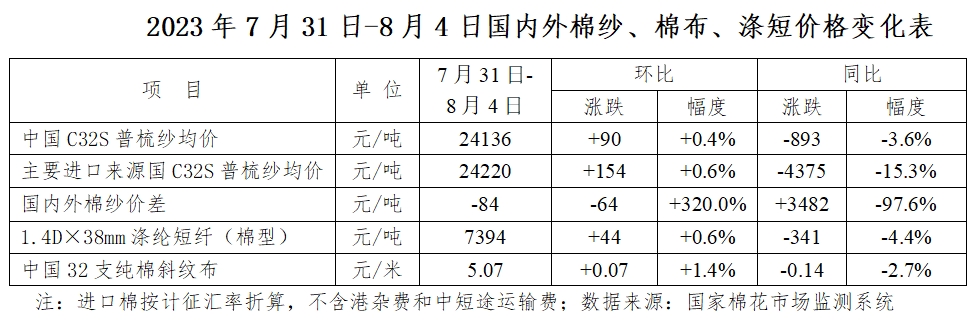 本周(2023年7月31日-8月4日),國內(nèi)棉花價格沖高回落,國際棉花價格震蕩走弱;國內(nèi)外棉紗價格上漲;滌綸短纖價格繼續(xù)回升。
