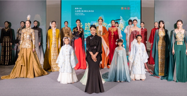 “絲路霓裳”是由著名設(shè)計(jì)師熊英帶領(lǐng)蓋婭傳說團(tuán)隊(duì)以絲綢之路為主題打造的一場(chǎng)時(shí)裝秀。它融匯了東西文明的瑰麗寶庫,以積淀千年的絲路文化給予設(shè)計(jì)師靈感,并帶領(lǐng)觀眾遁入一個(gè)充滿未知的意境世界。服裝將緙絲、蘇繡、羽繪等諸多東方工藝詮釋于作品之中,展示了端莊典雅而不失靈動(dòng)、古樸厚重而不失時(shí)尚的絲路之韻。