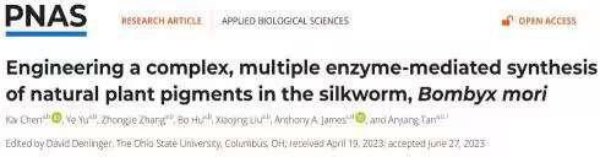 8月8日,PNAS在線發(fā)表了江蘇科技大學(xué)生物技術(shù)學(xué)院/農(nóng)業(yè)農(nóng)村部蠶桑遺傳改良重點實驗室譚安江團隊題為“Engineering a complex, multiple enzyme-mediated synthesis of natural plant pigments in the silkworm, Bombyx mori”的研究論文,該研究首次報道了在昆蟲(家蠶)中構(gòu)建天然植物化合物的多基因生物合成途徑,從而高效合成一種水溶性植物色素-甜菜紅素。