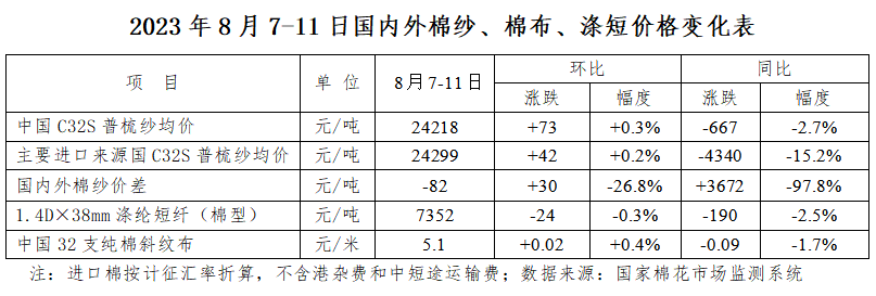 本周(2023年8月7-11日),國內(nèi)棉花價(jià)格穩(wěn)中有降,國際棉花價(jià)格震蕩上漲;國內(nèi)外棉紗價(jià)格繼續(xù)回升;滌綸短纖價(jià)格由漲轉(zhuǎn)跌。