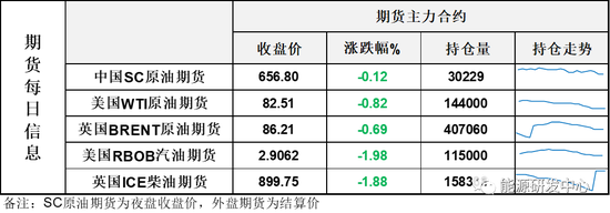 【1】WTI主力原油期貨收跌0.68美元,跌幅0.82%,報(bào)82.51美元/桶;布倫特主力原油期貨收跌0.6美元,跌幅0.69%,報(bào)86.21美元/桶;INE原油期貨收跌0.12%,報(bào)656.8元。