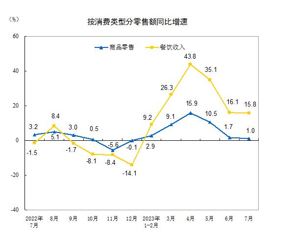 按消費(fèi)類型分,7月份,商品零售32483億元,同比增長1.0%;餐飲收入4277億元,增長15.8%。1—7月份,商品零售235742億元,同比增長5.9%;餐飲收入28606億元,增長20.5%。