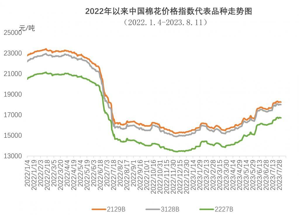 7月,國內(nèi)因主要棉區(qū)持續(xù)高溫天氣引發(fā)新棉減產(chǎn)預(yù)期,支撐棉價(jià)持續(xù)高位運(yùn)行,期現(xiàn)貨價(jià)格均創(chuàng)年度新高,中國棉花價(jià)格指數(shù)(CCIndex3128B)最高上漲至18070元/噸。月內(nèi),有關(guān)部門發(fā)布公告,為更好滿足棉紡企業(yè)用棉需求,將發(fā)放2023年棉花進(jìn)口滑準(zhǔn)稅配額,7月下旬開始組織銷售部分中央儲備棉。國際方面,受高溫降雨等不利天氣擾動,北半球主產(chǎn)棉國新棉減產(chǎn)預(yù)期增強(qiáng),棉價(jià)明顯上漲,但是在經(jīng)濟(jì)衰退預(yù)期的影響下,出現(xiàn)寬幅震蕩走勢,漲幅不及國內(nèi),內(nèi)外棉價(jià)差有所擴(kuò)大。