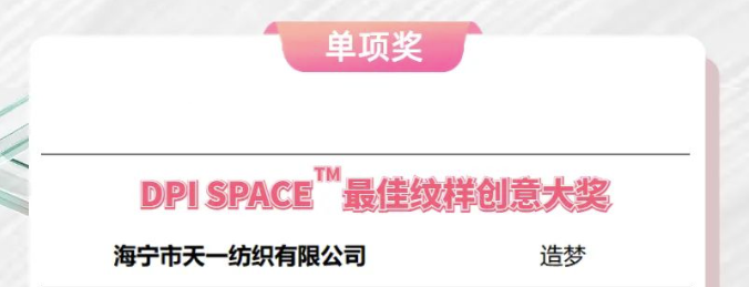 海寧市天一紡織有限公司的面料“造夢”榮獲DPISPACETM最佳紋樣創(chuàng)意大獎。