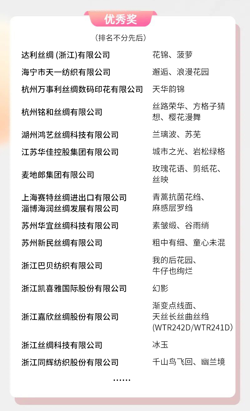 另外,還有眾多絲綢企業(yè)的參賽面料榮獲本次大賽優(yōu)秀獎(不完全統(tǒng)計):