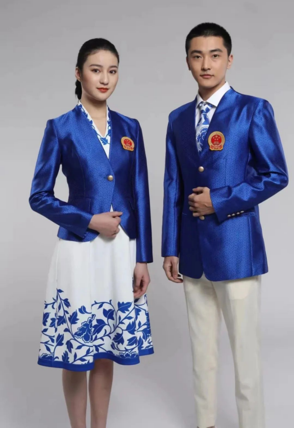 賀陽(yáng)說(shuō),按照中國(guó)體育代表團(tuán)慣例,往往選擇與往屆接近的款式作為服裝基本樣式。其中,男裝為“V”型領(lǐng)西裝,領(lǐng)子的肩頸處抬高,有中式立領(lǐng)子的意味,合體長(zhǎng)褲,白襯衣配領(lǐng)帶;女裝為合體上衣,“V”型領(lǐng)與男裝設(shè)計(jì)語(yǔ)言相同,內(nèi)搭牡丹紋樣的“A”型裙子。牡丹是中國(guó)的國(guó)花,纏枝牡丹圖形則源自青花瓷器上的紋樣。圖案經(jīng)過(guò)重新歸納后,簡(jiǎn)潔大方、形態(tài)完美,既保留了原圖案的典型特征,又契合“積極向上”“完美單純”“活潑明快”的特征,將中國(guó)傳統(tǒng)文化藝術(shù)與運(yùn)動(dòng)風(fēng)格相結(jié)合,體現(xiàn)了多元文化共生。