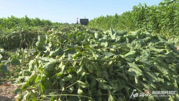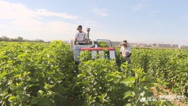 7月底,烏蘇市的蛋白桑種植基地,桑葉收獲機正在采收桑葉。