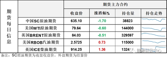 【1】WTI主力原油期貨收跌0.48美元,跌幅0.6%,報(bào)79.64美元/桶;布倫特主力原油期貨收跌0.43美元,跌幅0.51%,報(bào)84.03美元/桶;INE原油期貨收跌1.7%,報(bào)635.1元。