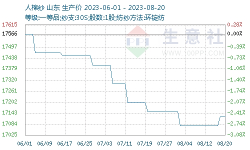 上周(2023年8月14—20日),人棉紗呈回暖趨勢,特別是渦流紡庫存出現(xiàn)下降,價(jià)格小幅提升,截止8月20日人棉紗(30S,環(huán)錠紡,一等品)出廠均價(jià)為17125元/噸,較前期價(jià)格上漲50元/噸。人棉紗開工率小幅回升至68.5%左右。下游對(duì)人棉紗需求微微好轉(zhuǎn),部分國外訂單出現(xiàn),下游采購積極性相對(duì)增強(qiáng)。