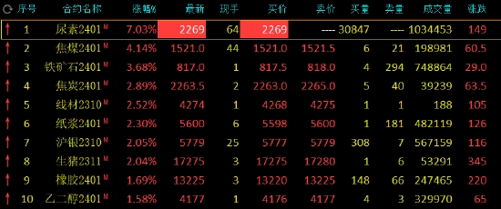 午盤(pán)收盤(pán),國(guó)內(nèi)期貨主力合約漲跌不一。尿素期貨主力合約封漲停板,漲7.03%,焦煤(1534, 13.50, 0.89%)漲超4%,鐵礦(827, 9.00, 1.10%)石漲超3%,焦炭(2268, 3.50, 0.15%)、紙漿、生豬、滬銀漲超2%;跌幅方面,菜粕、集運(yùn)指數(shù)(歐線(xiàn))、SC原油、低硫燃料油(LU)跌超2%,燃料油、豆粕(3994, 0.00, 0.00%)、液化石油氣(LPG)、白糖(6980, 70.00, 1.01%)跌超1%。