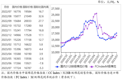 (三)內(nèi)外棉價差縮小。CotlookA指數(shù)(相當(dāng)于國內(nèi)3128B級棉花)折合人民幣每噸14735元,比中國棉花價格指數(shù)(CCIndex)3128B級每噸低2989元,價差比上月縮小56元。進(jìn)口棉價格指數(shù)(FCIndex)M級(相當(dāng)于國內(nèi)3128B級棉花)月均價每磅94.37美分,1%關(guān)稅下折到岸稅后價每噸16645元,比國內(nèi)價格低1079元,價差比上月縮小425元;滑準(zhǔn)稅下折到岸稅后價每噸16787元,比國內(nèi)價格低937元,價差比上月縮小408元。