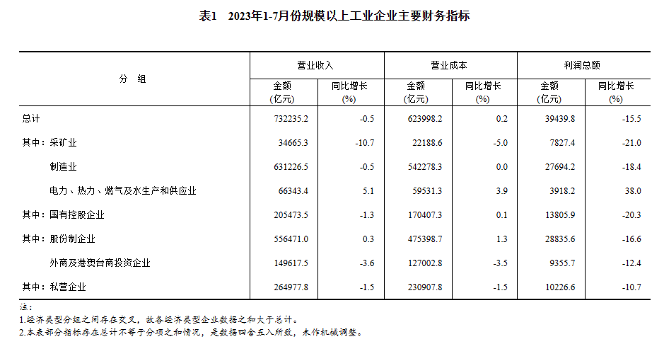 1—7月份,全國規(guī)模以上工業(yè)企業(yè)實現(xiàn)利潤總額39439.8億元,同比下降15.5%,降幅比1—6月份收窄1.3個百分點(按可比口徑計算,詳見附注二)。