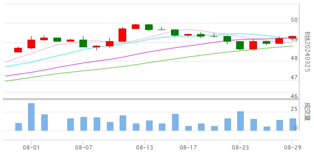 今日(2023年08月29日,周二)中國繭絲綢交易市場生絲指數(shù)上漲0.08%收于4900.23點。B絲(商檢4A級生絲):230925合約上漲0.03萬元報收于49.17萬元;240325合約上漲0.12萬元報收于49.32萬元;240925合約上漲0.09萬元報收于48.48萬元。