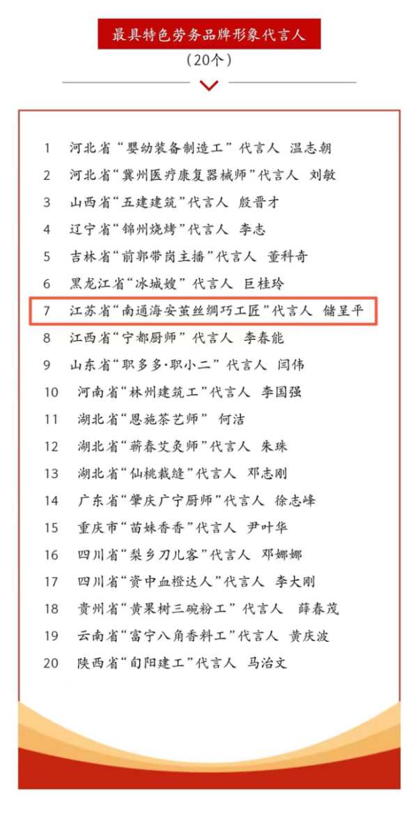 日前,中國勞動保障報社組織開展了“第二屆勞務品牌形象代言人征集展示活動”,中國絲綢協(xié)會副會長,鑫緣集團黨委書記、董事長、總經(jīng)理儲呈平成功入選“最具特色勞務品牌形象代言人”。