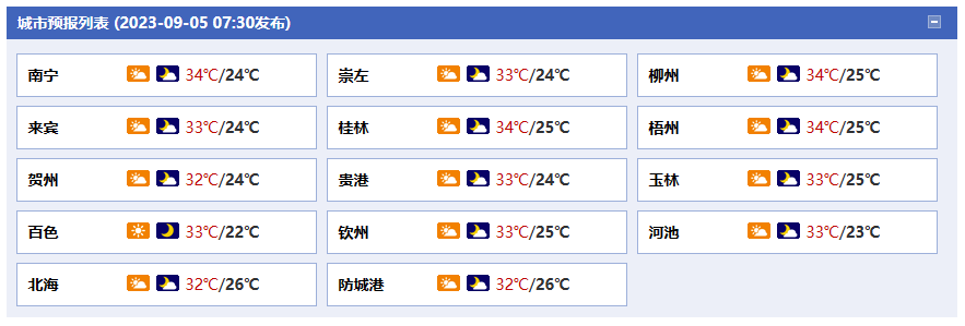 南寧市:今天白天到晚上,多云間晴天,東北風(fēng)1~2級(jí),最高氣溫34℃,最低氣溫24℃。