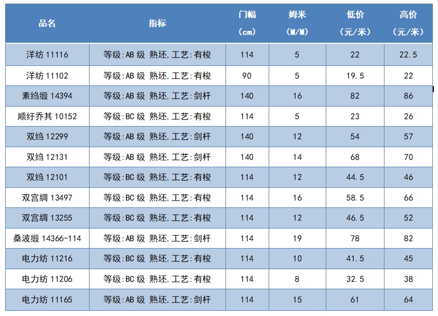 本周綢緞指數(shù)協(xié)作單位成交價(jià)格區(qū)間