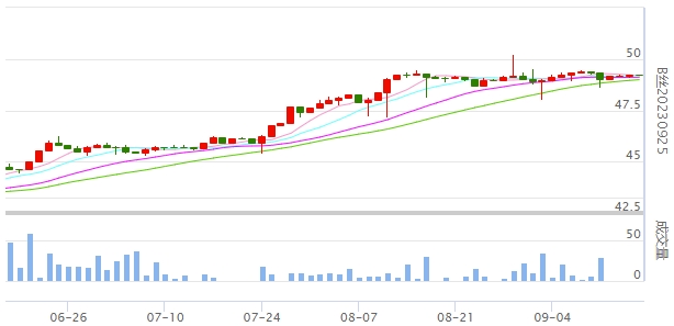 今日(2023年09月15日,周五)中國(guó)繭絲綢交易市場(chǎng)生絲指數(shù)微漲0.06%收于4911.97點(diǎn),本周生絲指數(shù)下跌0.31%。B絲(商檢4A級(jí)生絲):230925合約報(bào)平收于49.23萬(wàn)元;240325合約上漲0.15萬(wàn)元報(bào)收于49.47萬(wàn)元;240925合約上漲0.12萬(wàn)元報(bào)收于48.39萬(wàn)元。230925生絲合約日線