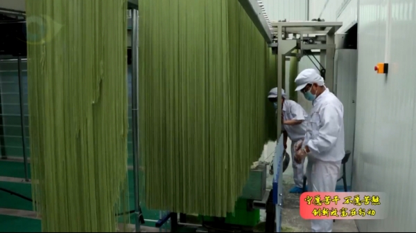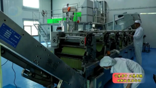 這幾天,在太極鎮(zhèn)農(nóng)業(yè)加工園內(nèi)的桑葉面加工廠廠房里,機器聲轟鳴。自動生產(chǎn)線上,工人們身著工作服,統(tǒng)一佩戴口罩,利用桑葉進行桑葉面生產(chǎn),發(fā)酵、壓面、切面,嚴格按照規(guī)范操作著機器,一根根綠色的面條在生產(chǎn)線上緩緩成型。