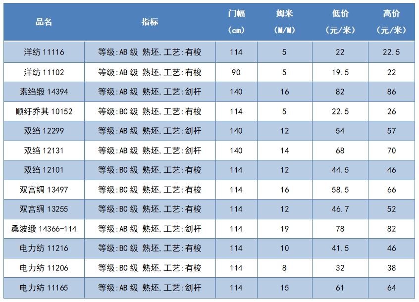 本周綢緞指數(shù)協(xié)作單位成交價(jià)格區(qū)間