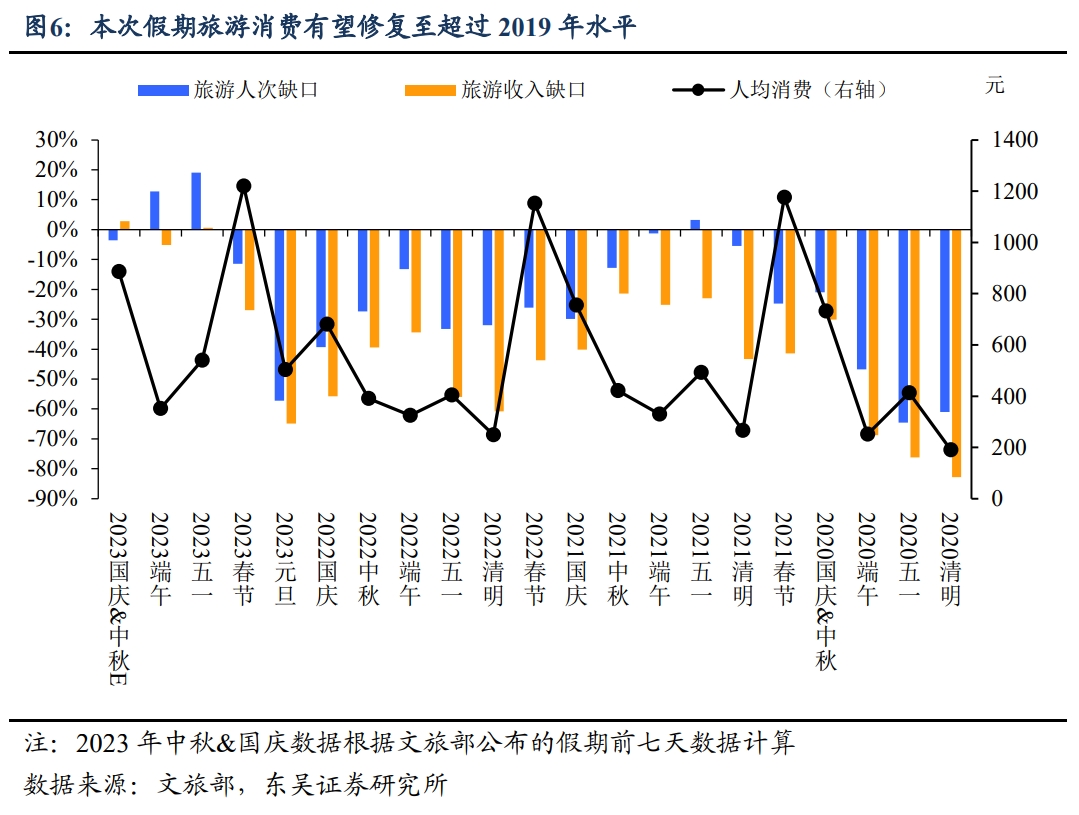 消費(fèi):有望超2019年同期。旅游方面,文旅部公布假期前七天國(guó)內(nèi)出游人次同比增長(zhǎng)78.9%,旅游收入同比增長(zhǎng)132.6%,由于本次假期多一天的“助攻”,2023年雙節(jié)假期的旅游收入與人次大概率均恢復(fù)至2019年同期水平之上;假期前七天人均消費(fèi)886元也超過(guò)了2019年830元的水平;反映疫后“復(fù)陽(yáng)”擔(dān)憂消散后首個(gè)國(guó)慶長(zhǎng)假居民消費(fèi)再迎釋放,消費(fèi)信心有望回歸正軌。