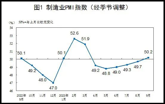 9月30日上午9點(diǎn)半國(guó)家統(tǒng)計(jì)局公布,中國(guó)9月官方制造業(yè)PMI為50.2,預(yù)期為50,前值為49.7。